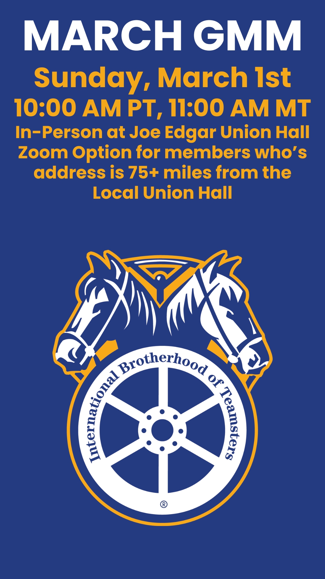 The Teamsters Local 162 March General Membership Meeting will be held on March 1st at 10:00 AM PT, at Joe Edgar Union Hall in Portland, OR. For members who are 75+ miles away from the Local, you may join via Zoom to hear reports of Officers. The Zoom portion of our membership meeting will begin at 10:00 AM PT, 11:00 AM MT. |